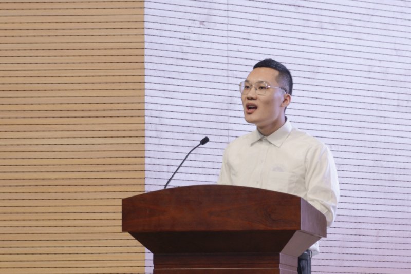 然后优秀毕业生代表马新峰发表毕业感言,马新峰首先代表18级毕业生表达了对学校的不舍和对老师的感激,回顾了四年的大学生活,总结了大学四年的收获与不足,最后和同学们做出了20年之约,大家约定20年之后再相聚。