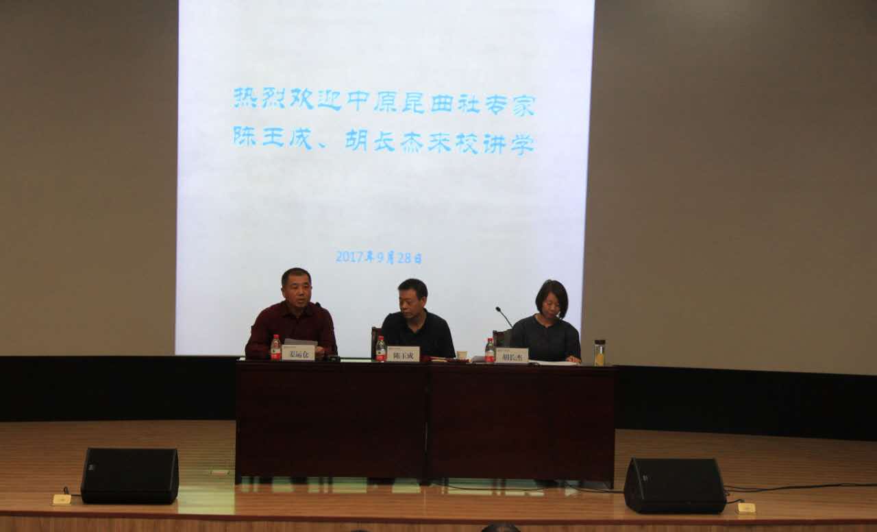 2017年9月28日下午,人文社会科学学院在第二报告厅召开昆曲专题讲座。该讲座由中原昆曲社专家陈玉成、胡长杰主讲,人文社会科学学院院长姜运仓、党总支副书记李达、副院长邓晓成出席此次讲座,人文社会科学学院大三全体学生参加了本次讲座,本次讲座由院长姜运仓主持。