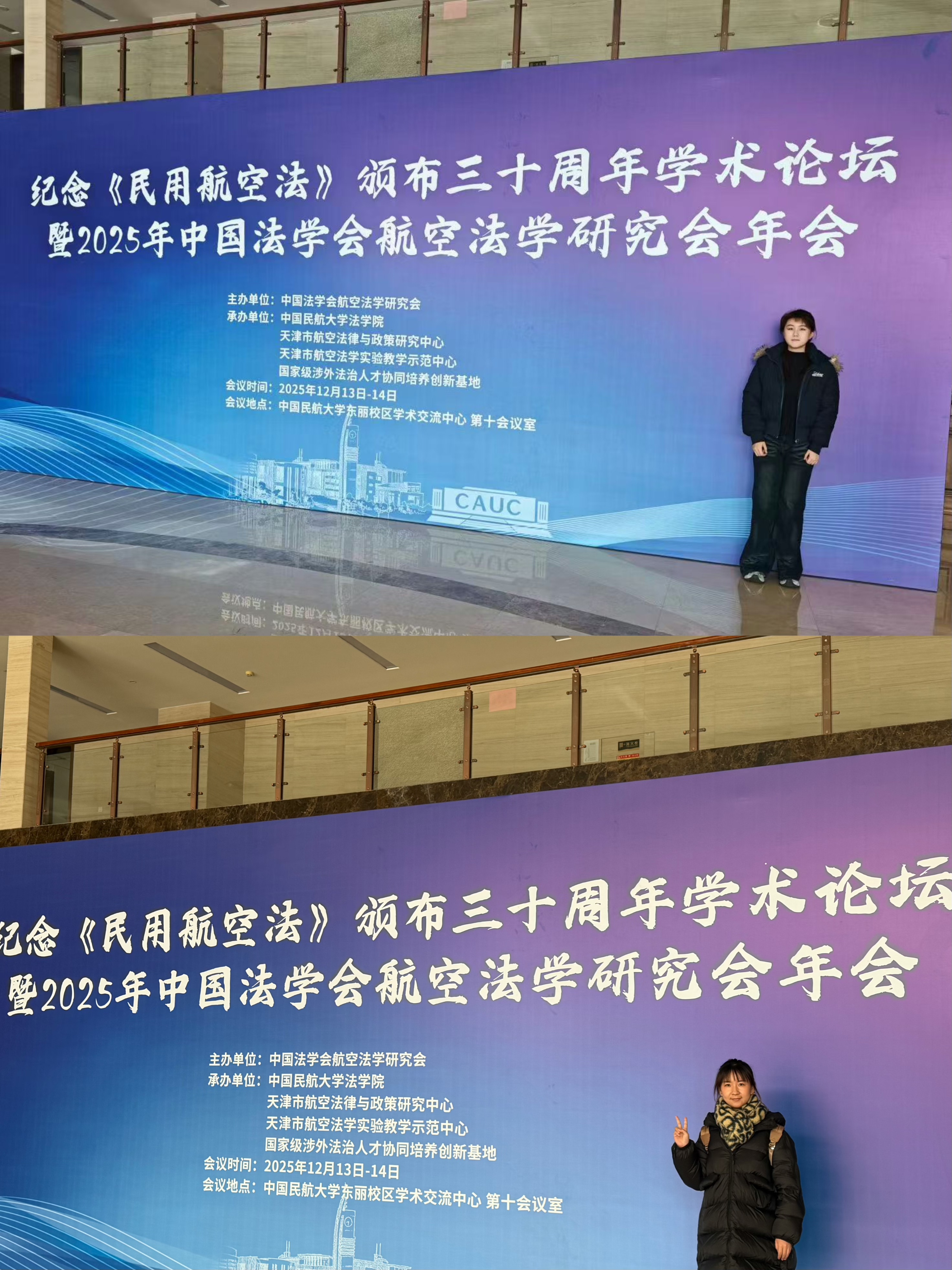2025年12月13日至14日,2025年中国法学会航空法学研究会年会在天津成功举行。来自高等院校、科研机构、民航行政机关及航空企业的百余位专家学者与实务工作者齐聚一堂,围绕“民航法实施三十周年”主题,展开了深入研讨。我院研究生邵豫蒙、李佳音参会学习并提交了论文。